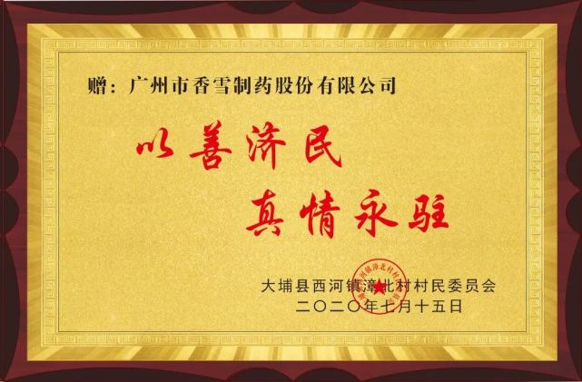 本次爱心捐赠活动得到了当地村民的称赞。因此,大埔县西河镇漳北村村民委员会特授予香雪制药“以善济民 真情永驻”牌匾,感谢香雪制药的善举。